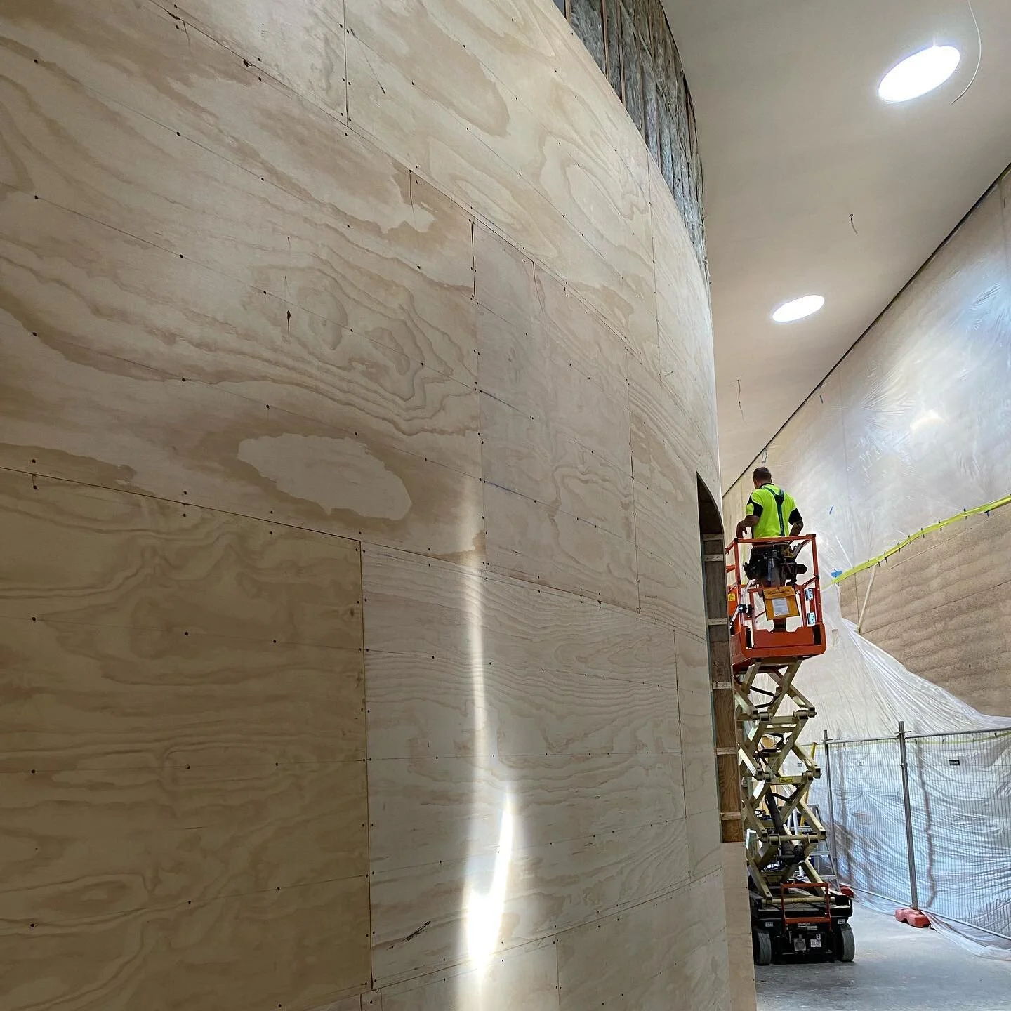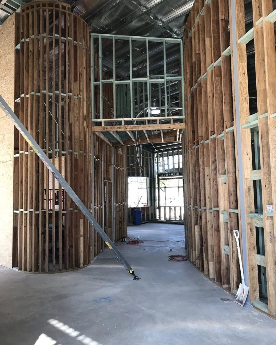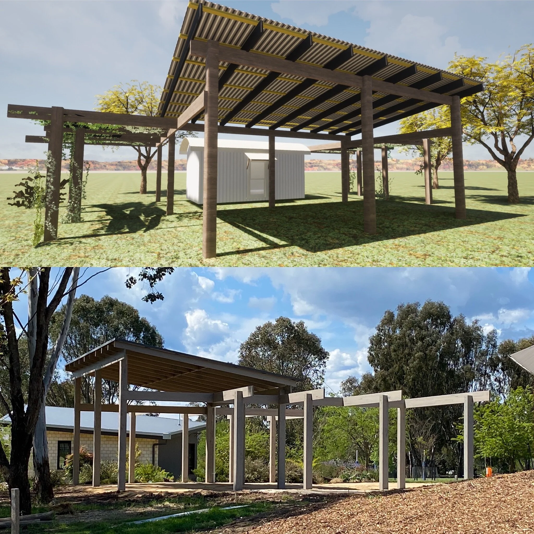 Timber roof frame building phase of an educational facility designed by Maya & Moss Architects