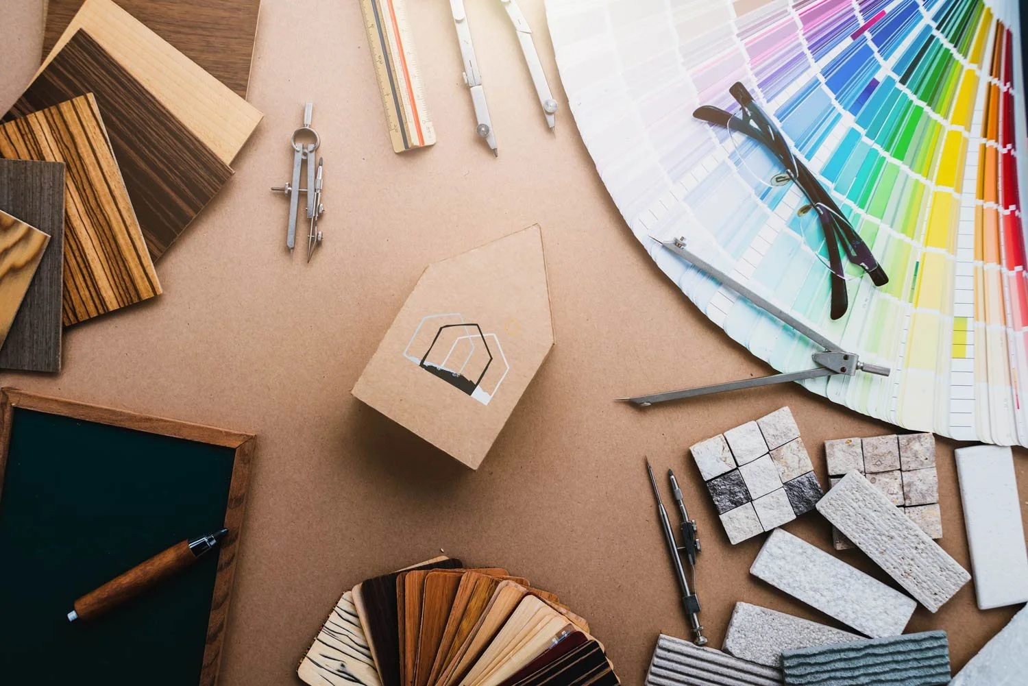 Flooring samples, colour swatches and interior samples for architectural project planning by Maya & Moss Architects